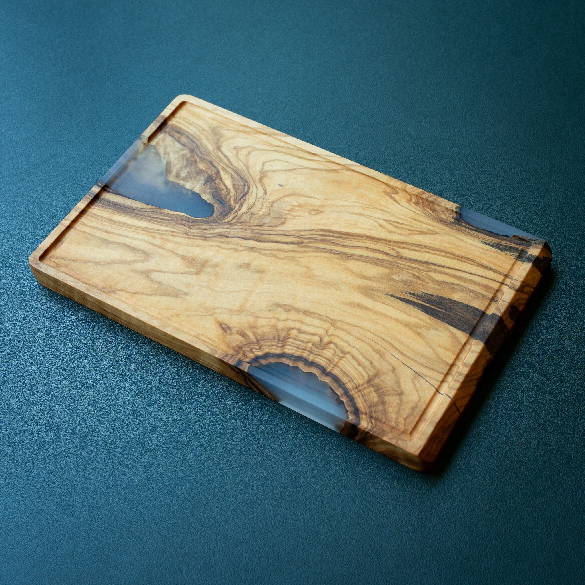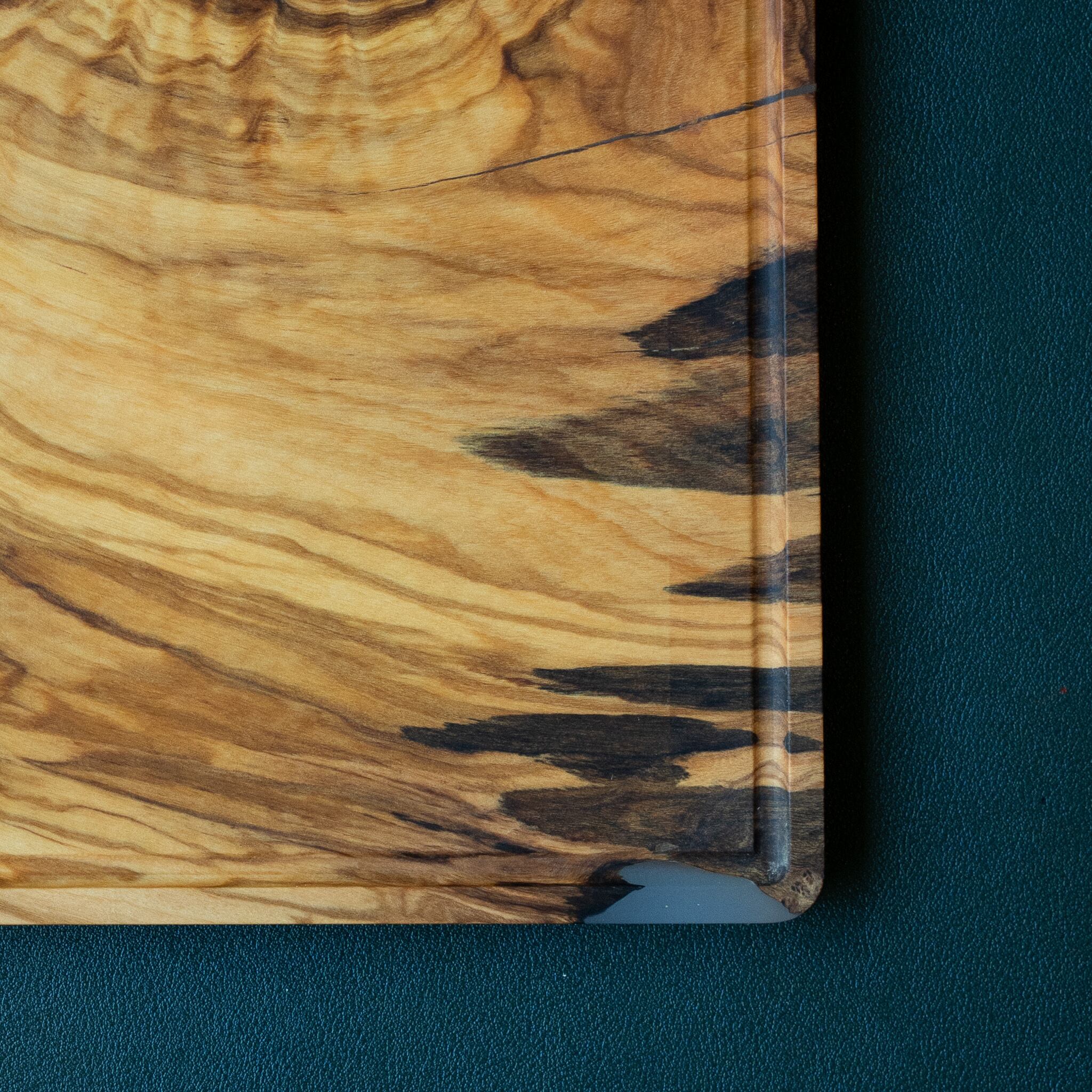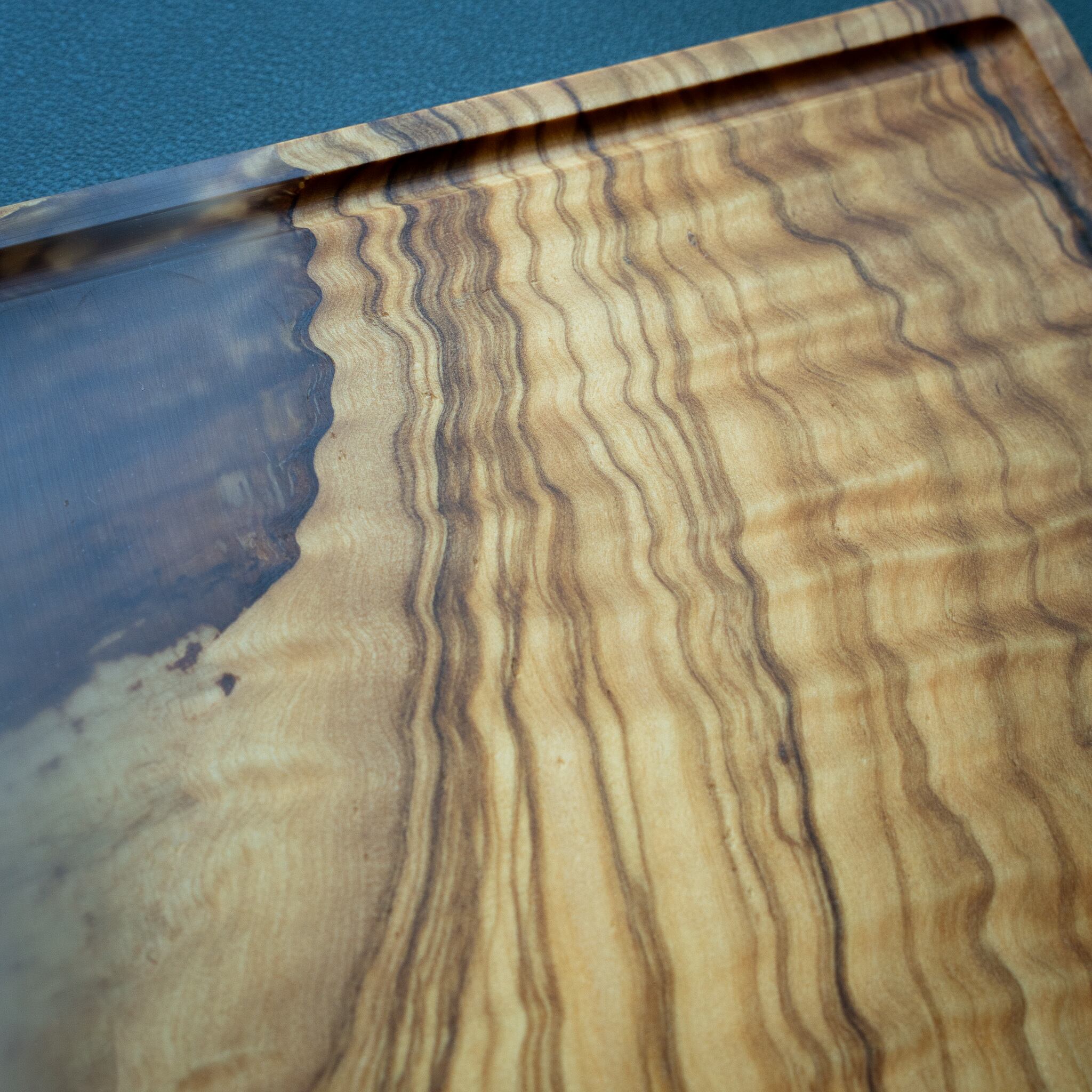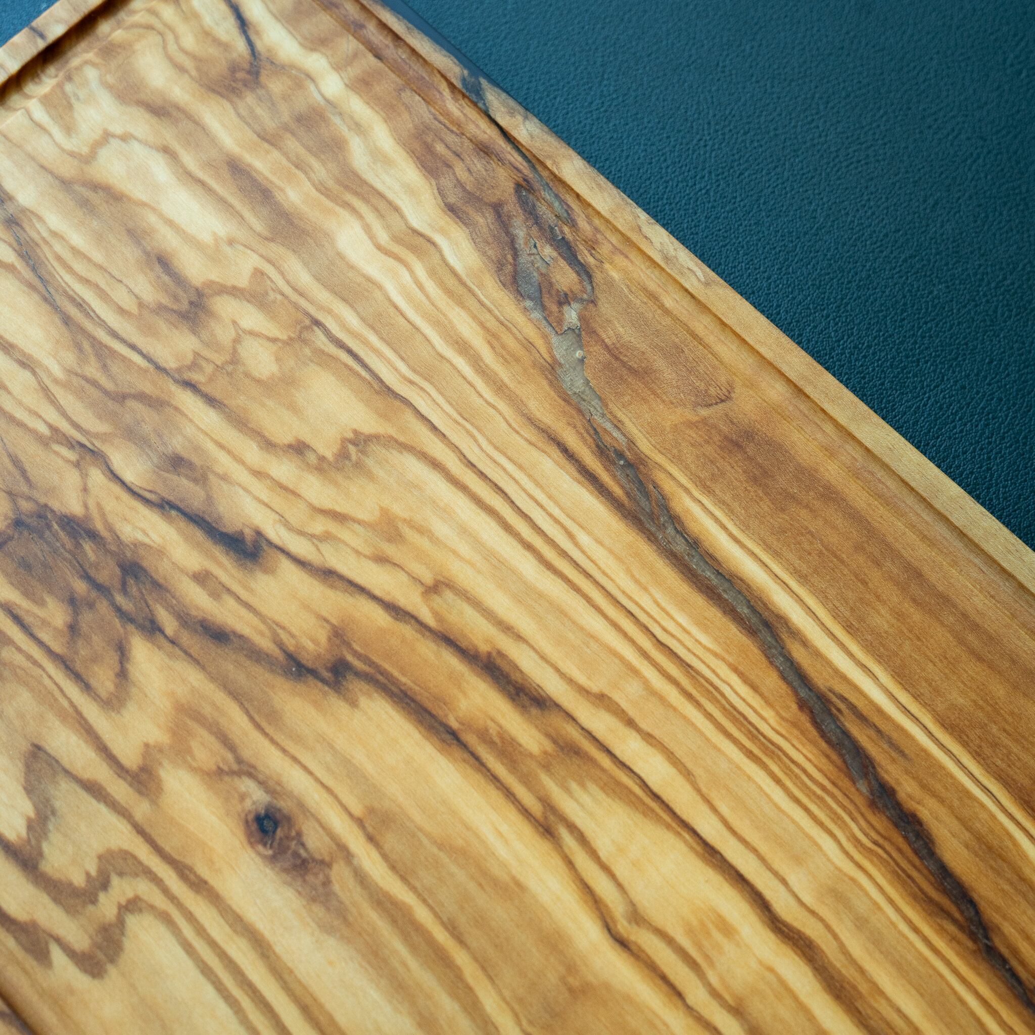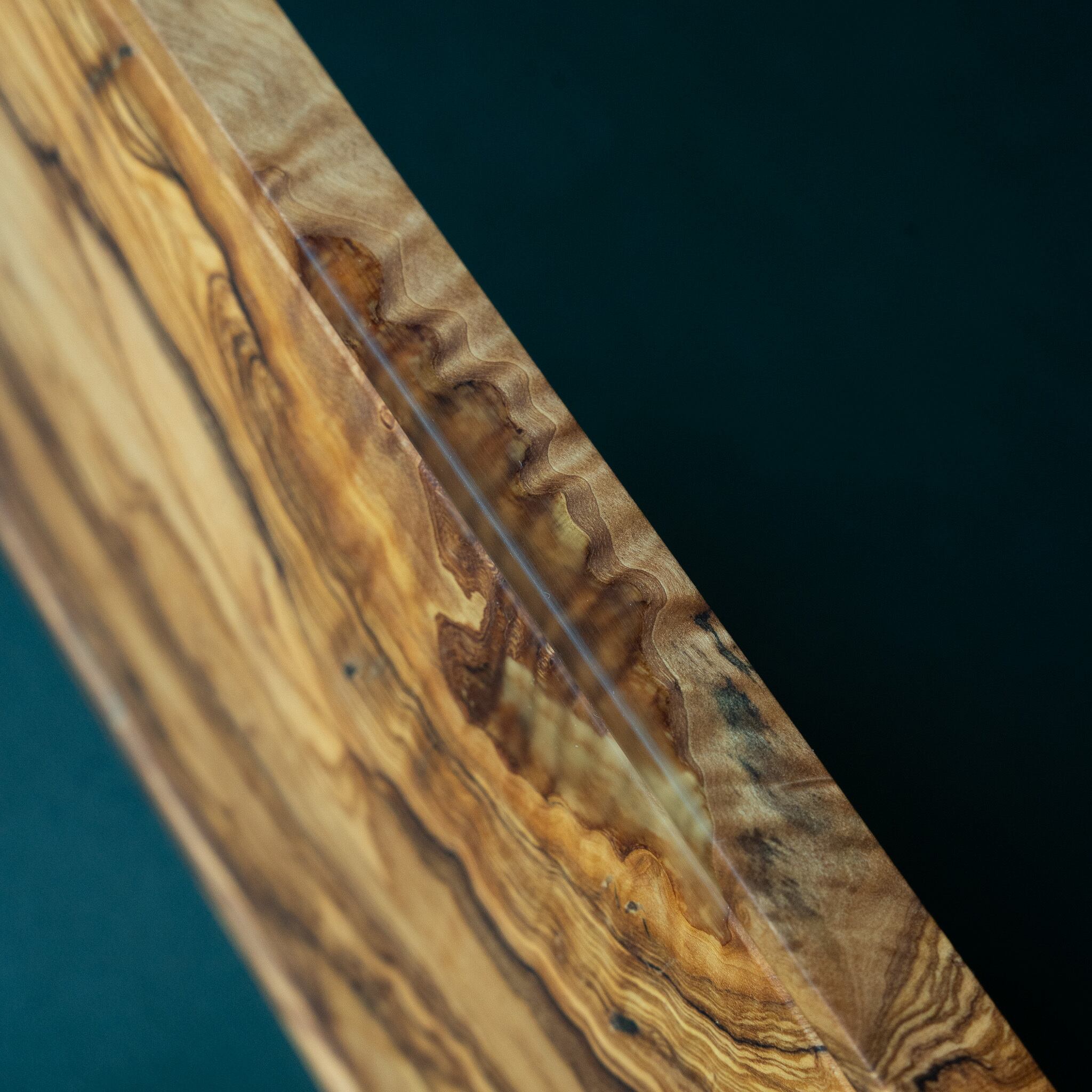 木目がまるで水面に風が通り抜けたように細かく波打ち、全体に複雑で立体感のある模様を描いています。このような木肌は、木が長年にわたり緩やかな環境変化を受けながら成長した証であり、オリーブ材の中でも極めて希少な部位にしか現れません。波状のラインは明瞭かつ繊細で、光の角度によって印象が変わり、自然素材ならではの奥深さを堪能できます。節には美しい湖を感じられるようにレジンで仕上げられており、木の表情と調和しながら、現代的な洗練さも感じられます。長く眺めていたくなるような芸術性を備えた一枚です。
