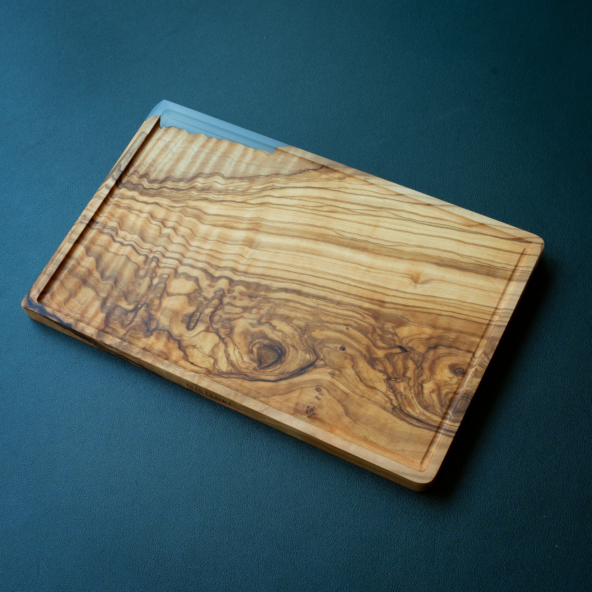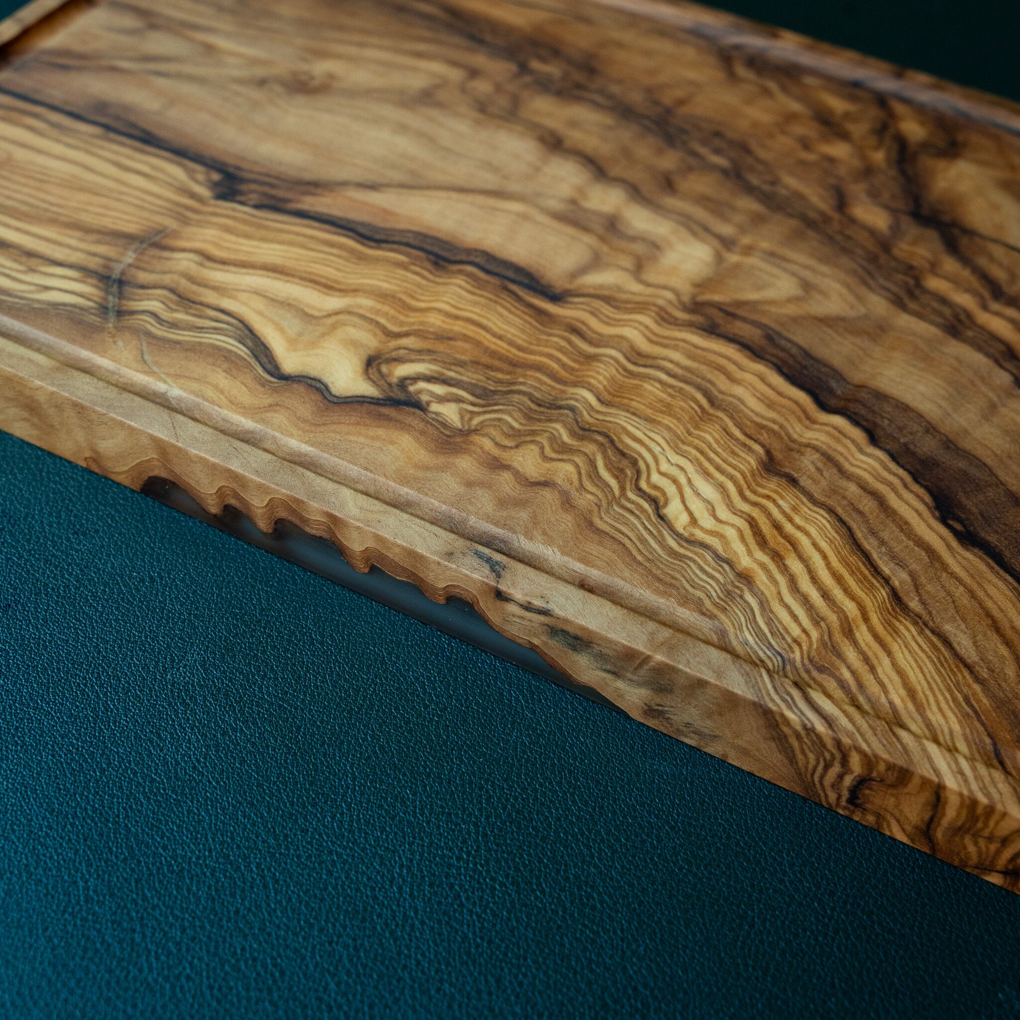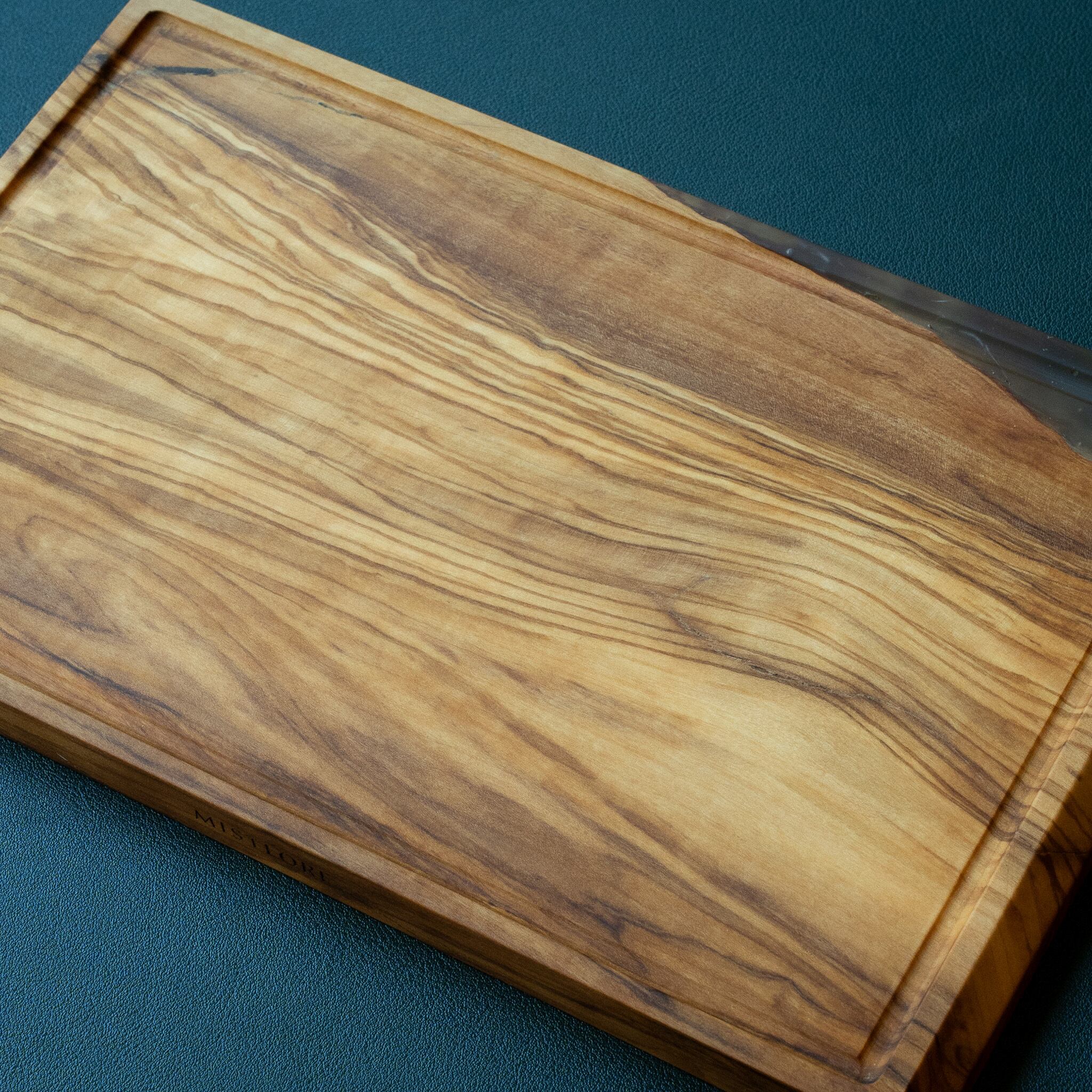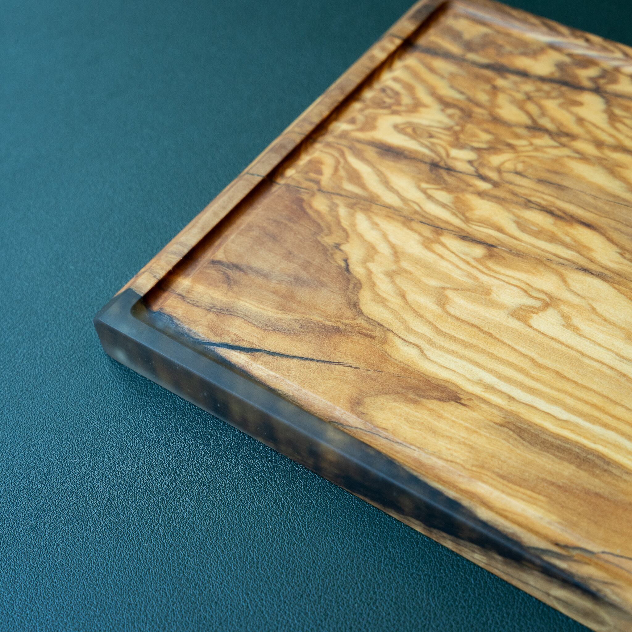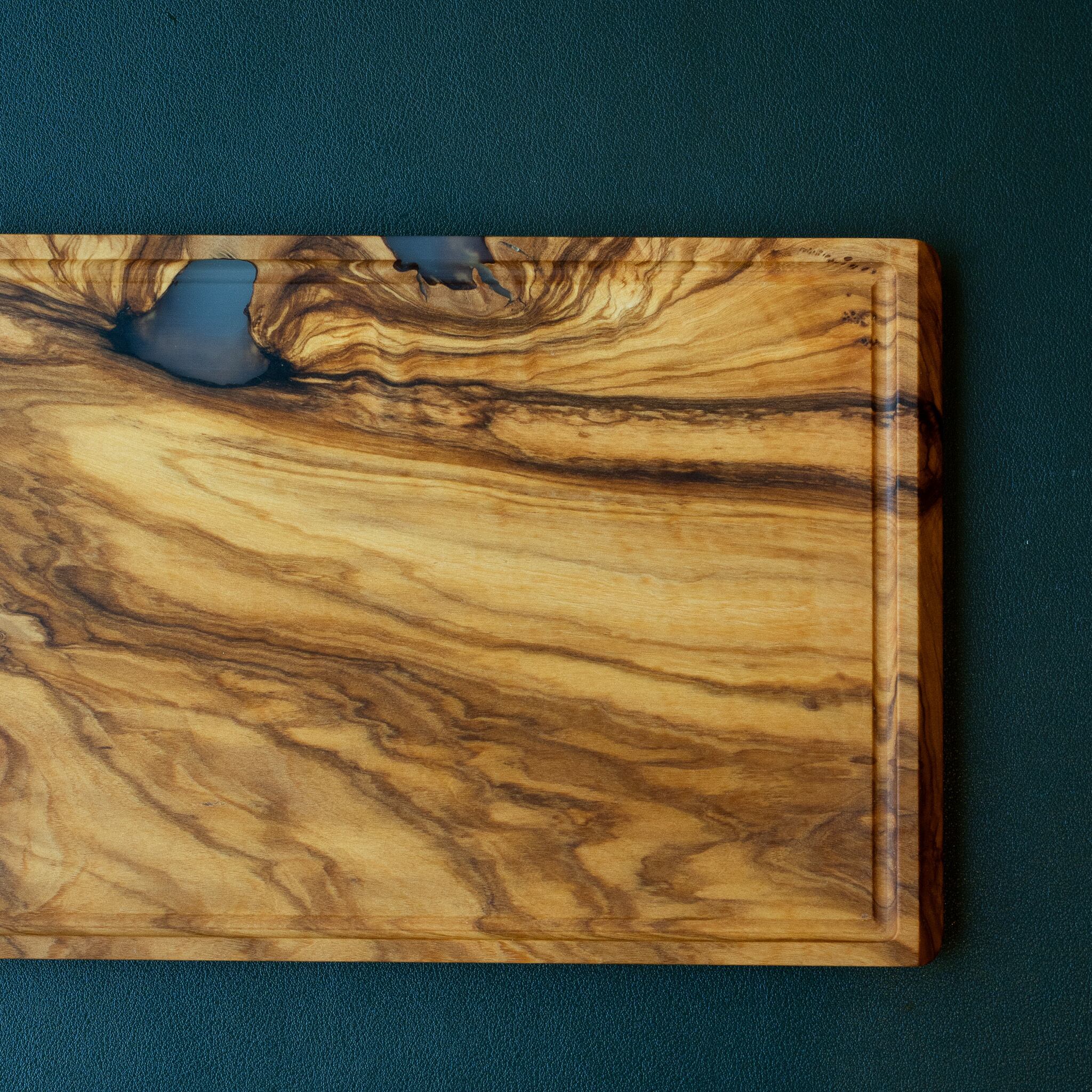 木目がまるで水面に風が通り抜けたように細かく波打ち、全体に複雑で立体感のある模様を描いています。このような木肌は、木が長年にわたり緩やかな環境変化を受けながら成長した証であり、オリーブ材の中でも極めて希少な部位にしか現れません。波状のラインは明瞭かつ繊細で、光の角度によって印象が変わり、自然素材ならではの奥深さを堪能できます。節には美しい湖を感じられるようにレジンで仕上げられており、木の表情と調和しながら、現代的な洗練さも感じられます。長く眺めていたくなるような芸術性を備えた一枚です。