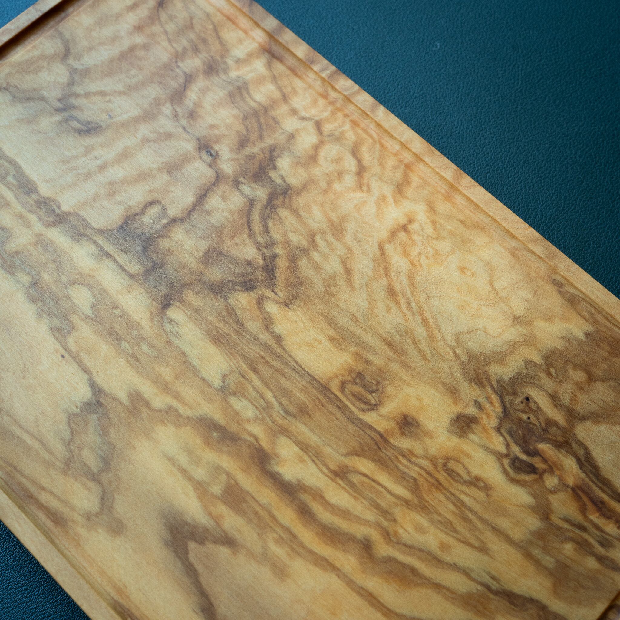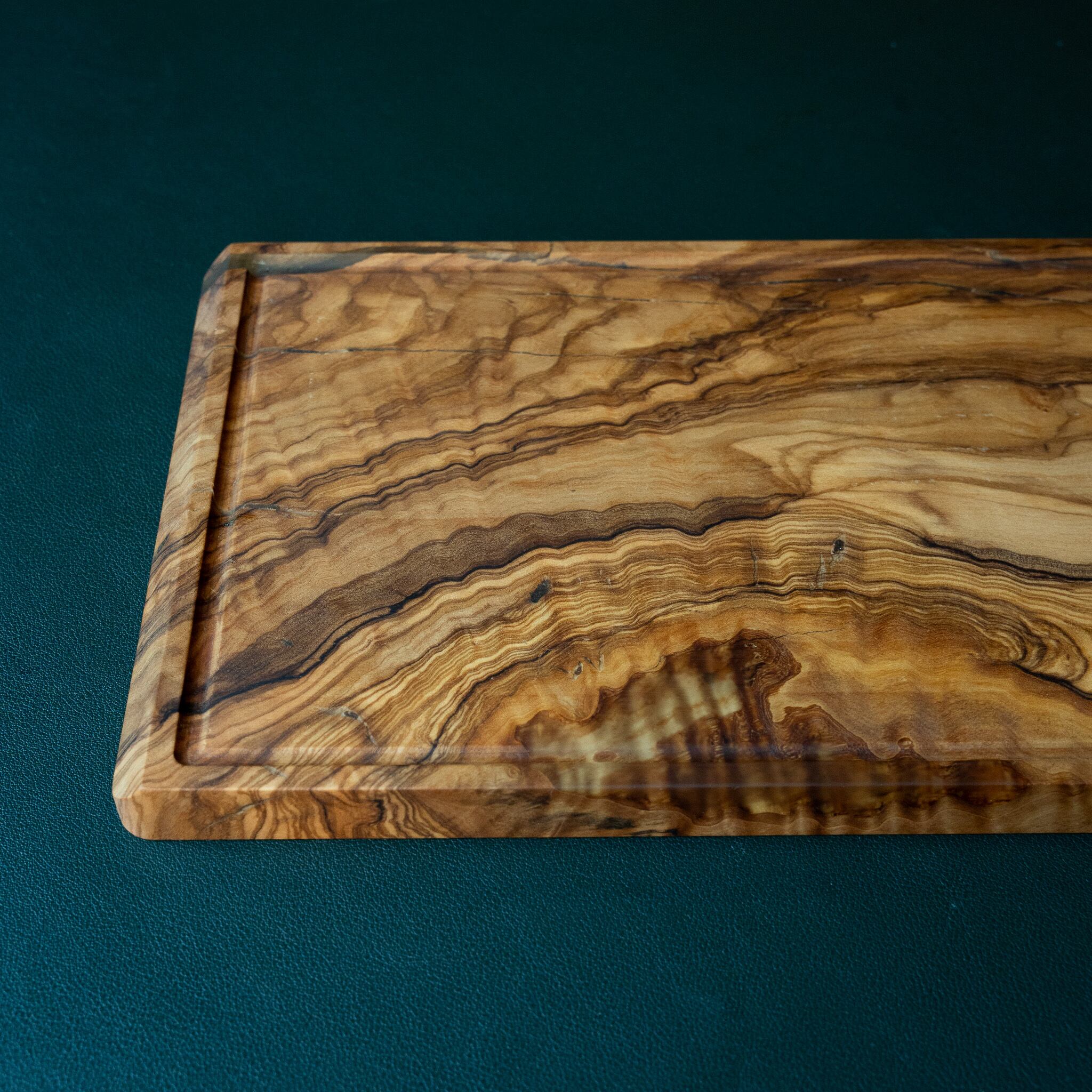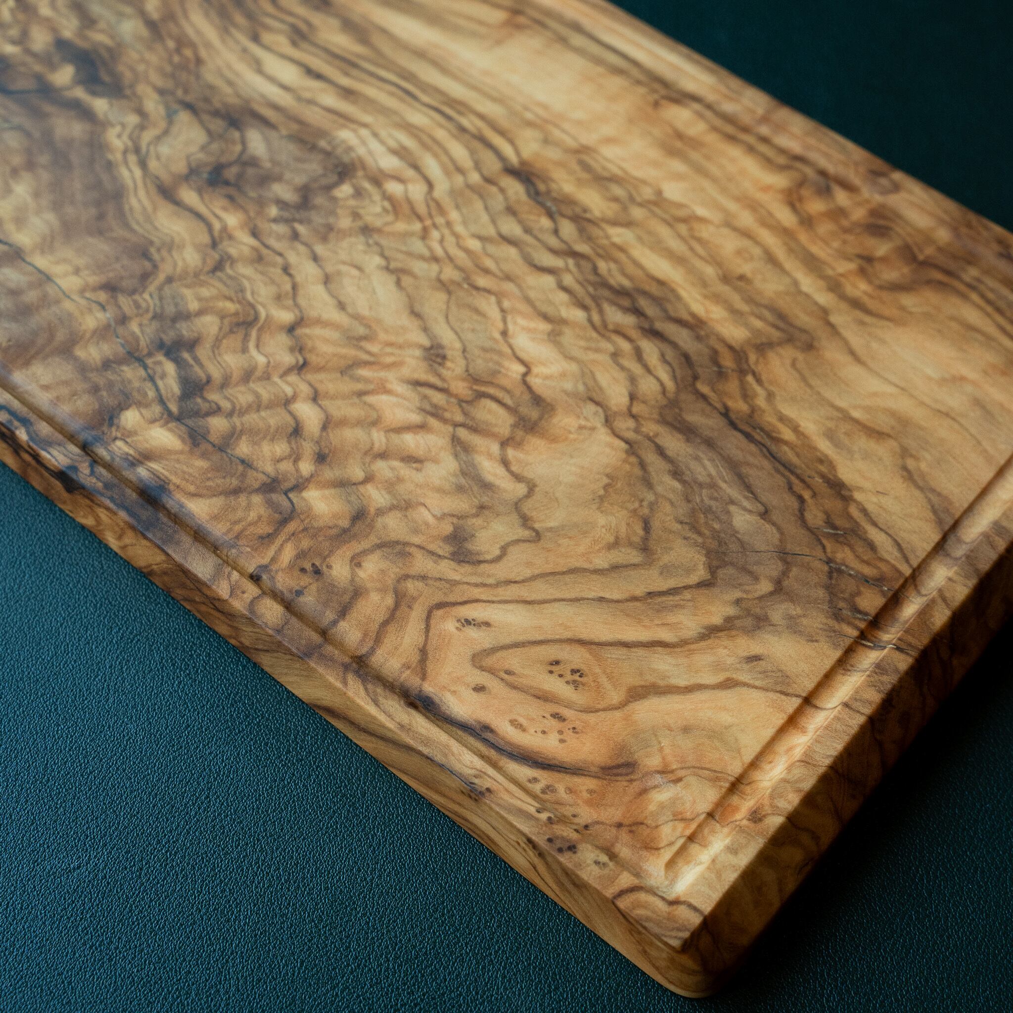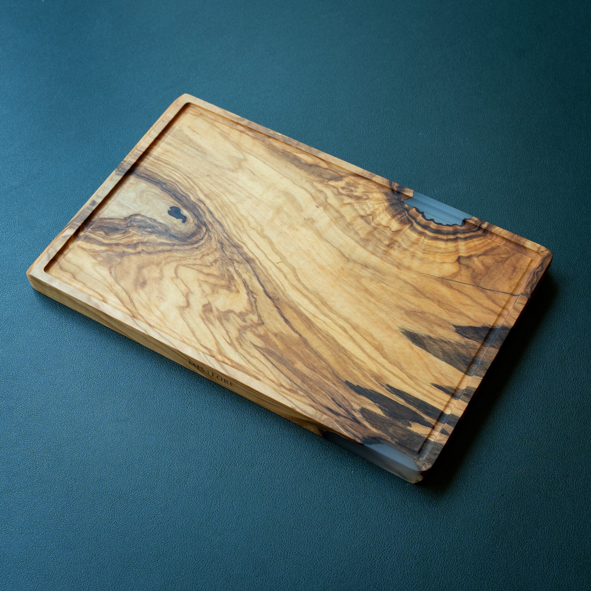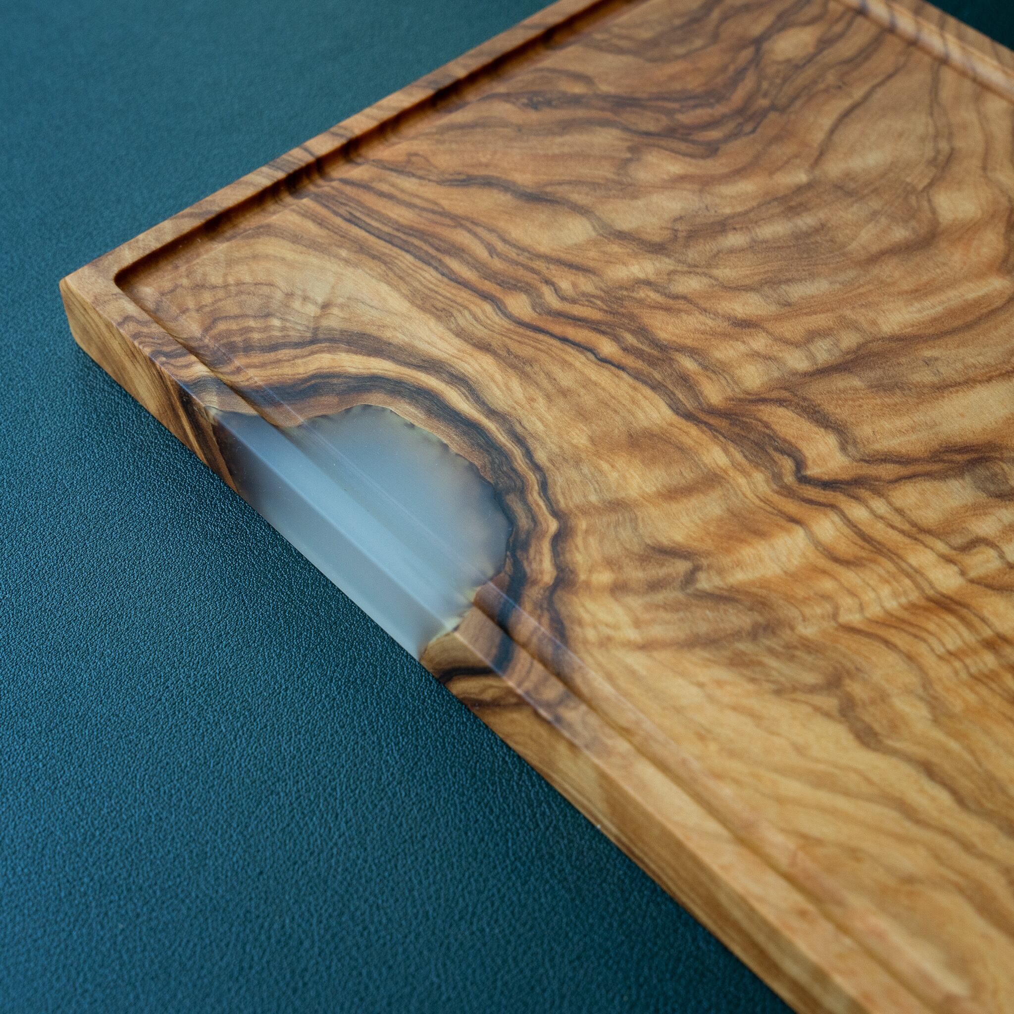 木目がまるで水面に風が通り抜けたように細かく波打ち、全体に複雑で立体感のある模様を描いています。このような木肌は、木が長年にわたり緩やかな環境変化を受けながら成長した証であり、オリーブ材の中でも極めて希少な部位にしか現れません。波状のラインは明瞭かつ繊細で、光の角度によって印象が変わり、自然素材ならではの奥深さを堪能できます。節には美しい湖を感じられるようにレジンで仕上げられており、木の表情と調和しながら、現代的な洗練さも感じられます。長く眺めていたくなるような芸術性を備えた一枚です。