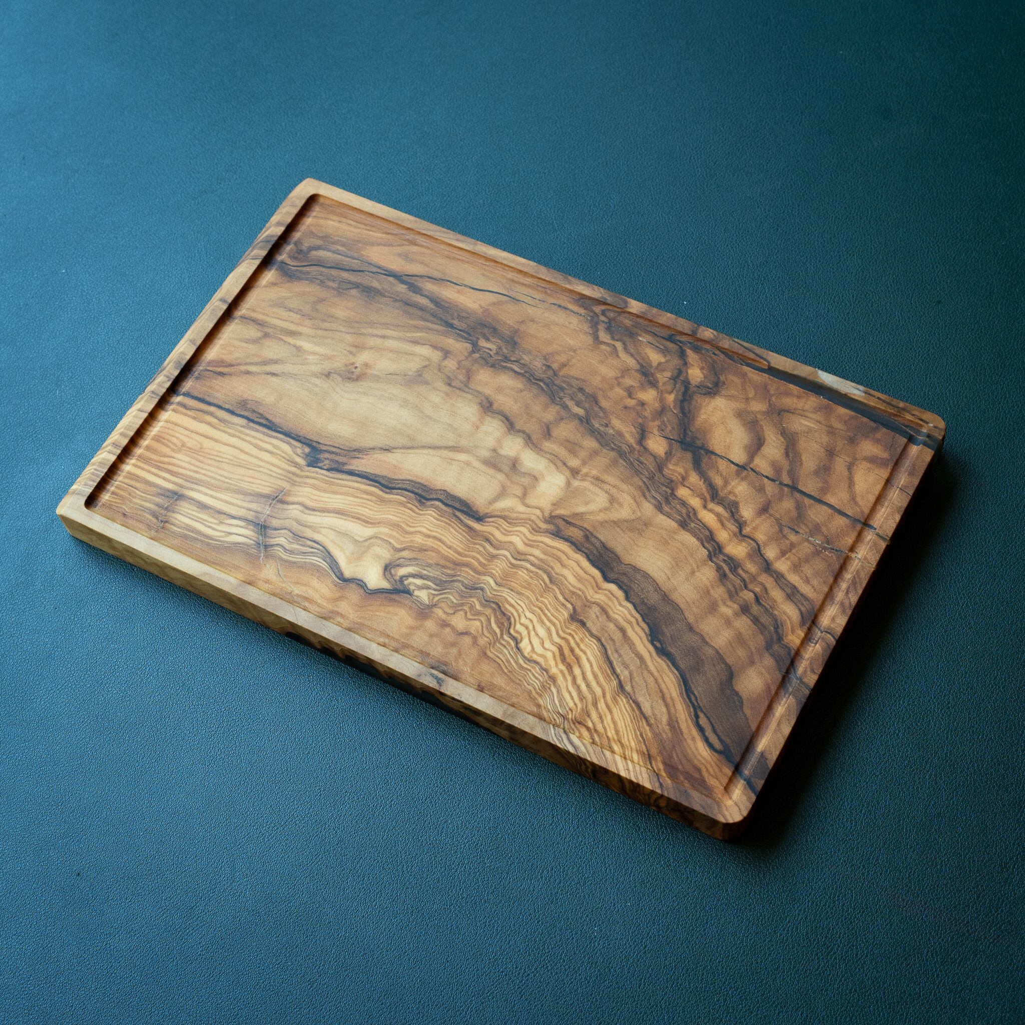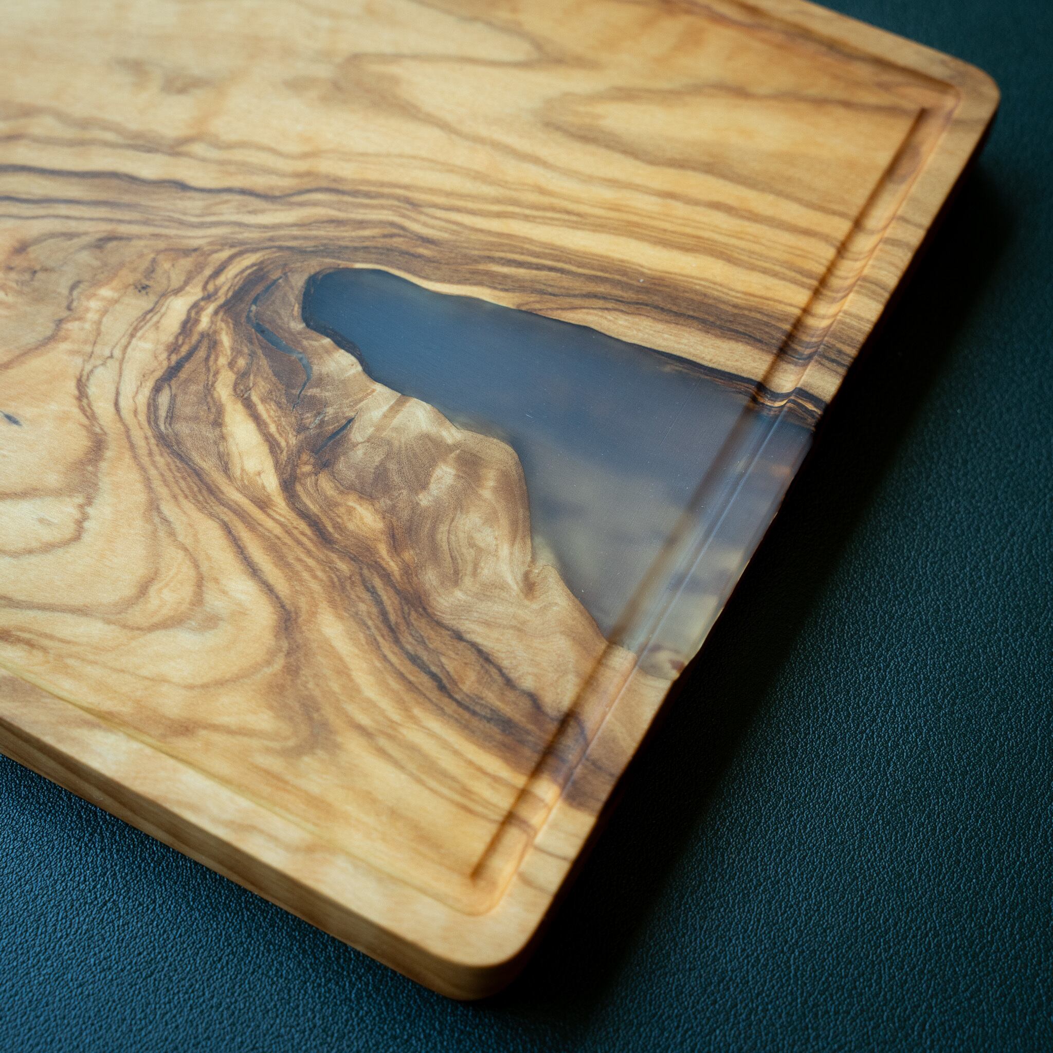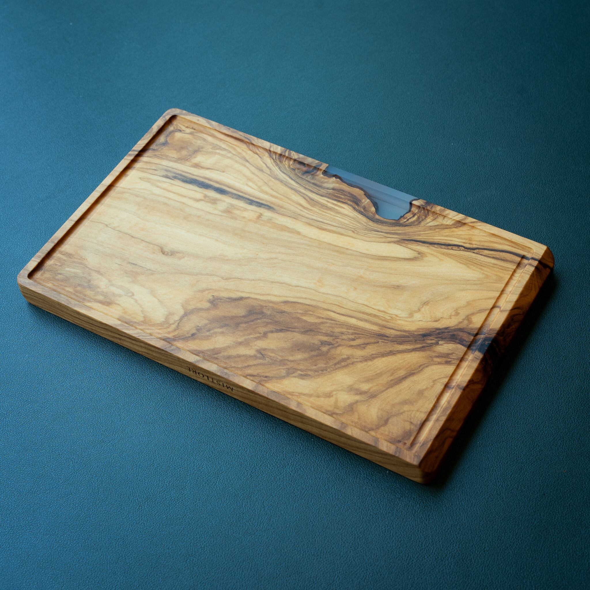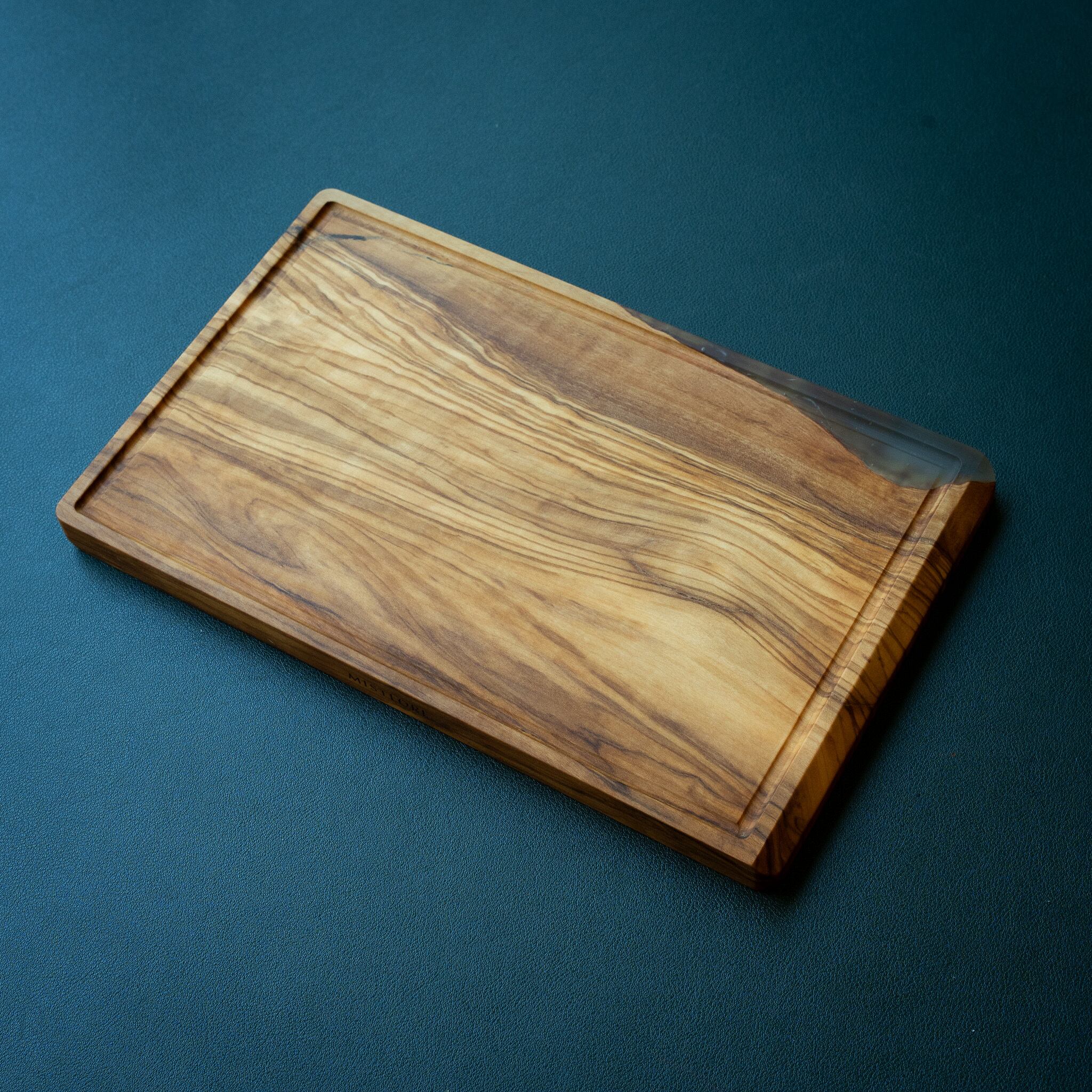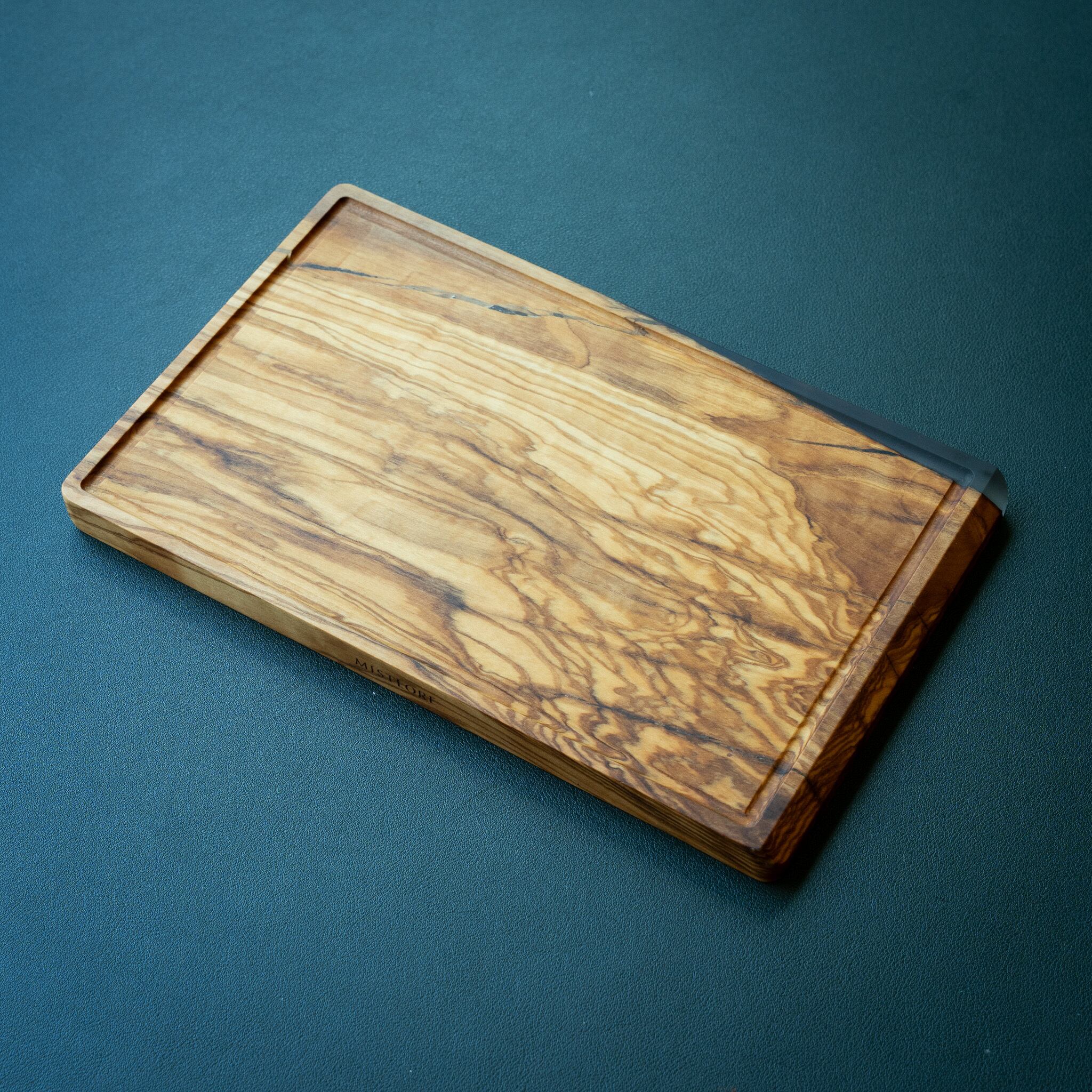 木目がまるで水面に風が通り抜けたように細かく波打ち、全体に複雑で立体感のある模様を描いています。このような木肌は、木が長年にわたり緩やかな環境変化を受けながら成長した証であり、オリーブ材の中でも極めて希少な部位にしか現れません。波状のラインは明瞭かつ繊細で、光の角度によって印象が変わり、自然素材ならではの奥深さを堪能できます。節には美しい湖を感じられるようにレジンで仕上げられており、木の表情と調和しながら、現代的な洗練さも感じられます。長く眺めていたくなるような芸術性を備えた一枚です。