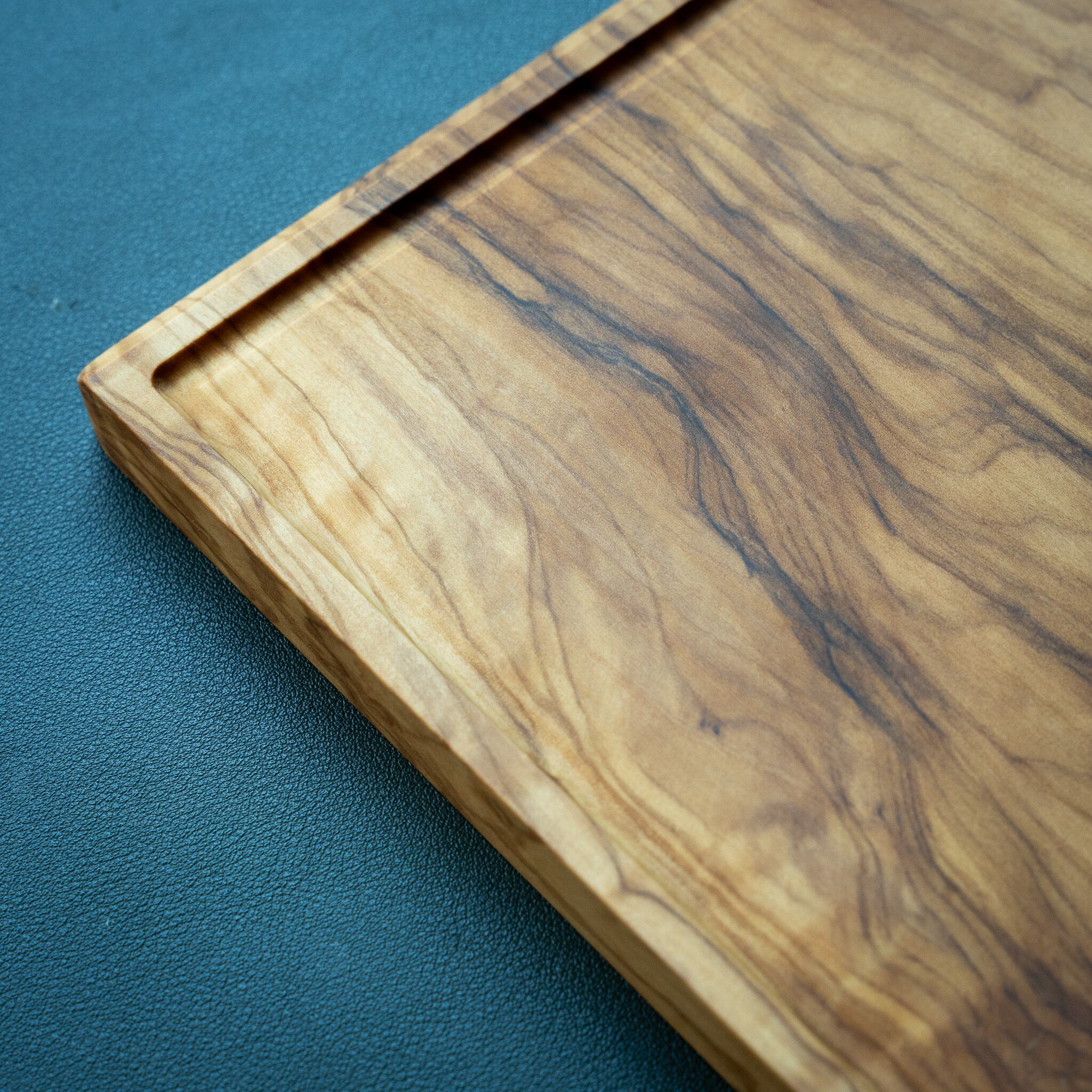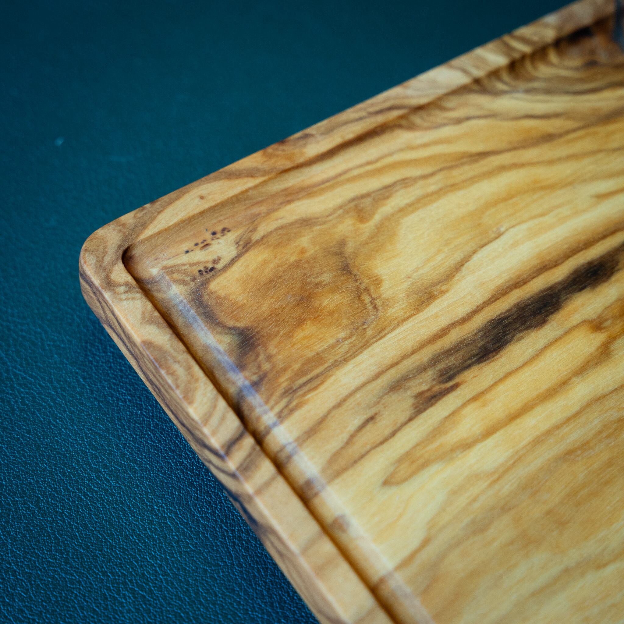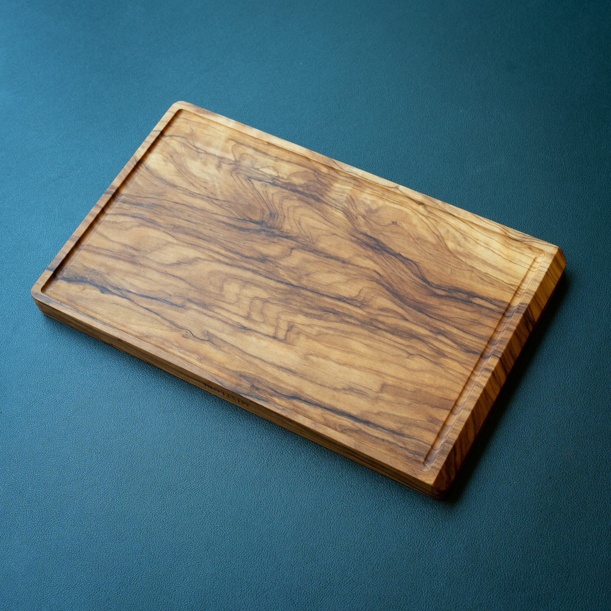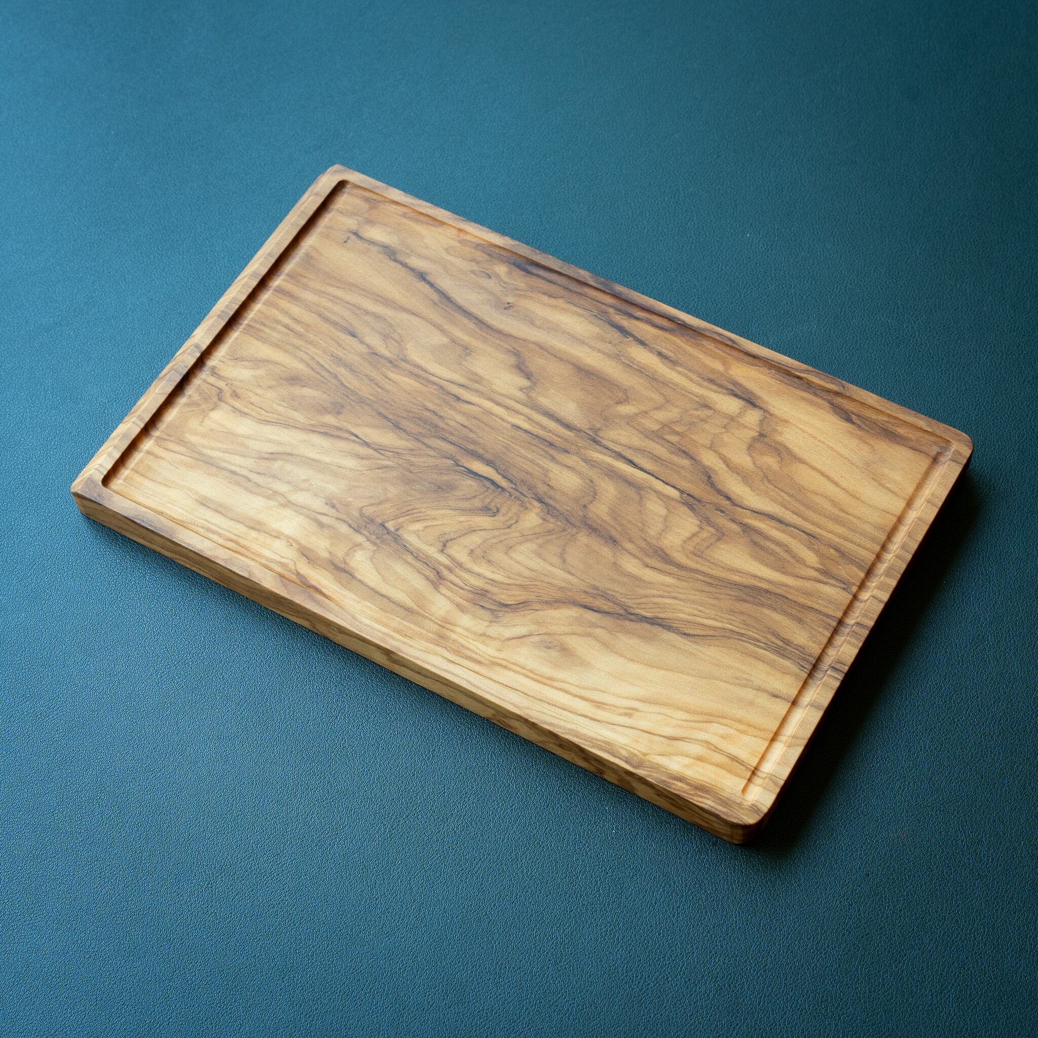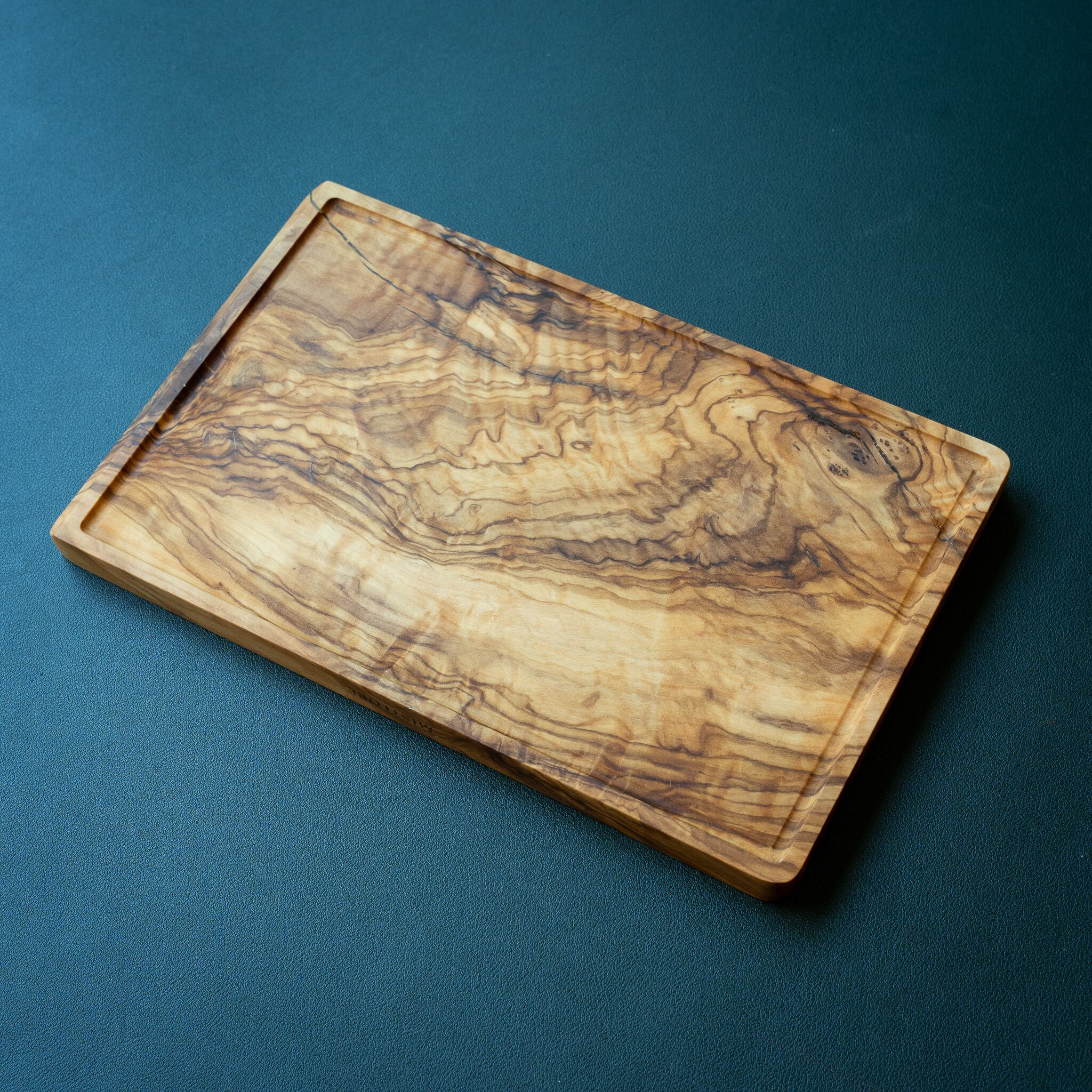 木目がまるで水面に風が通り抜けたように細かく波打ち、全体に複雑で立体感のある模様を描いています。このような木肌は、木が長年にわたり緩やかな環境変化を受けながら成長した証であり、オリーブ材の中でも極めて希少な部位にしか現れません。波状のラインは明瞭かつ繊細で、光の角度によって印象が変わり、自然素材ならではの奥深さを堪能できます。節には美しい湖を感じられるようにレジンで仕上げられており、木の表情と調和しながら、現代的な洗練さも感じられます。長く眺めていたくなるような芸術性を備えた一枚です。