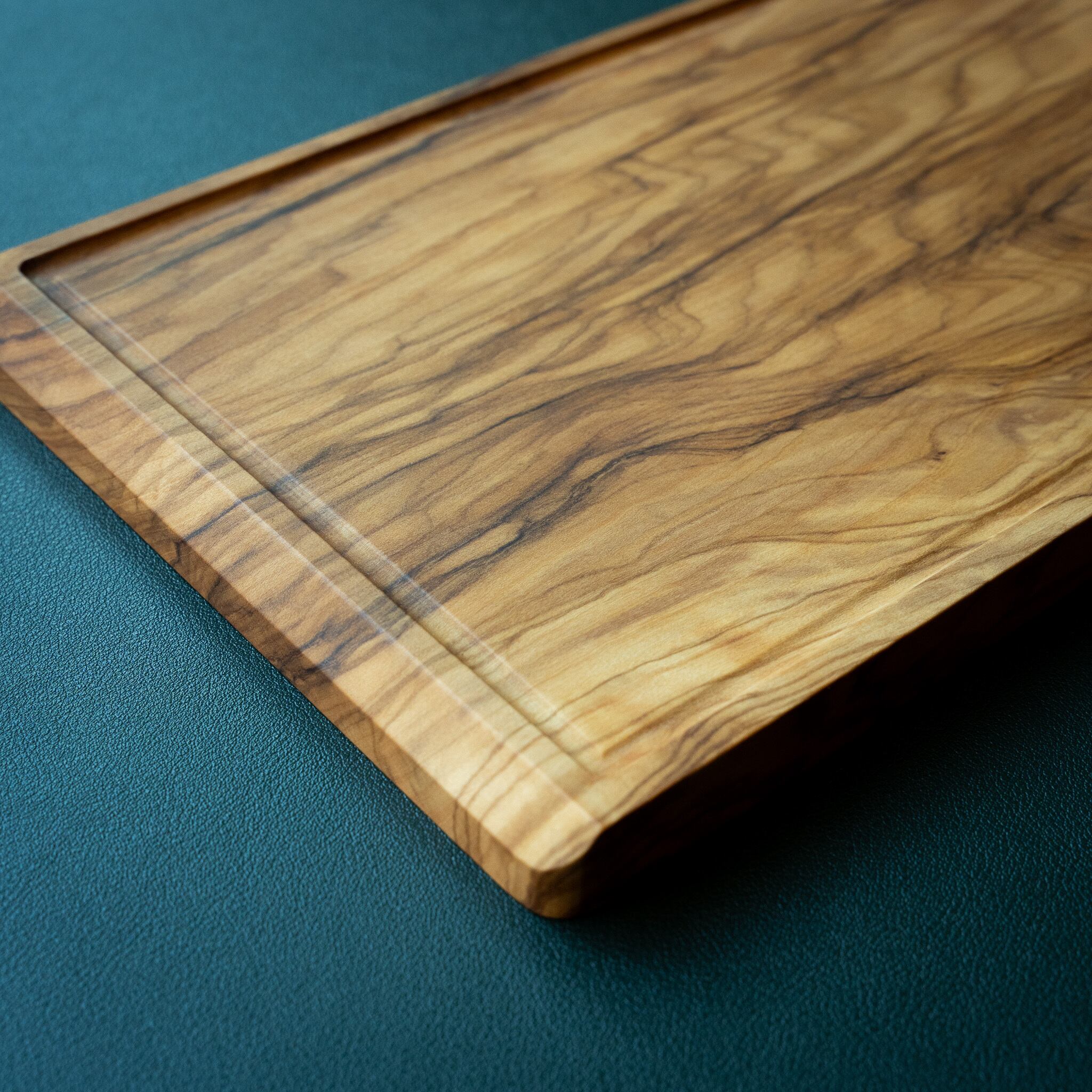 このカッティングボードは、盤面の周囲をぐるりと囲むように溝を施しており、食材から出た汁気をしっかりキャッチ。