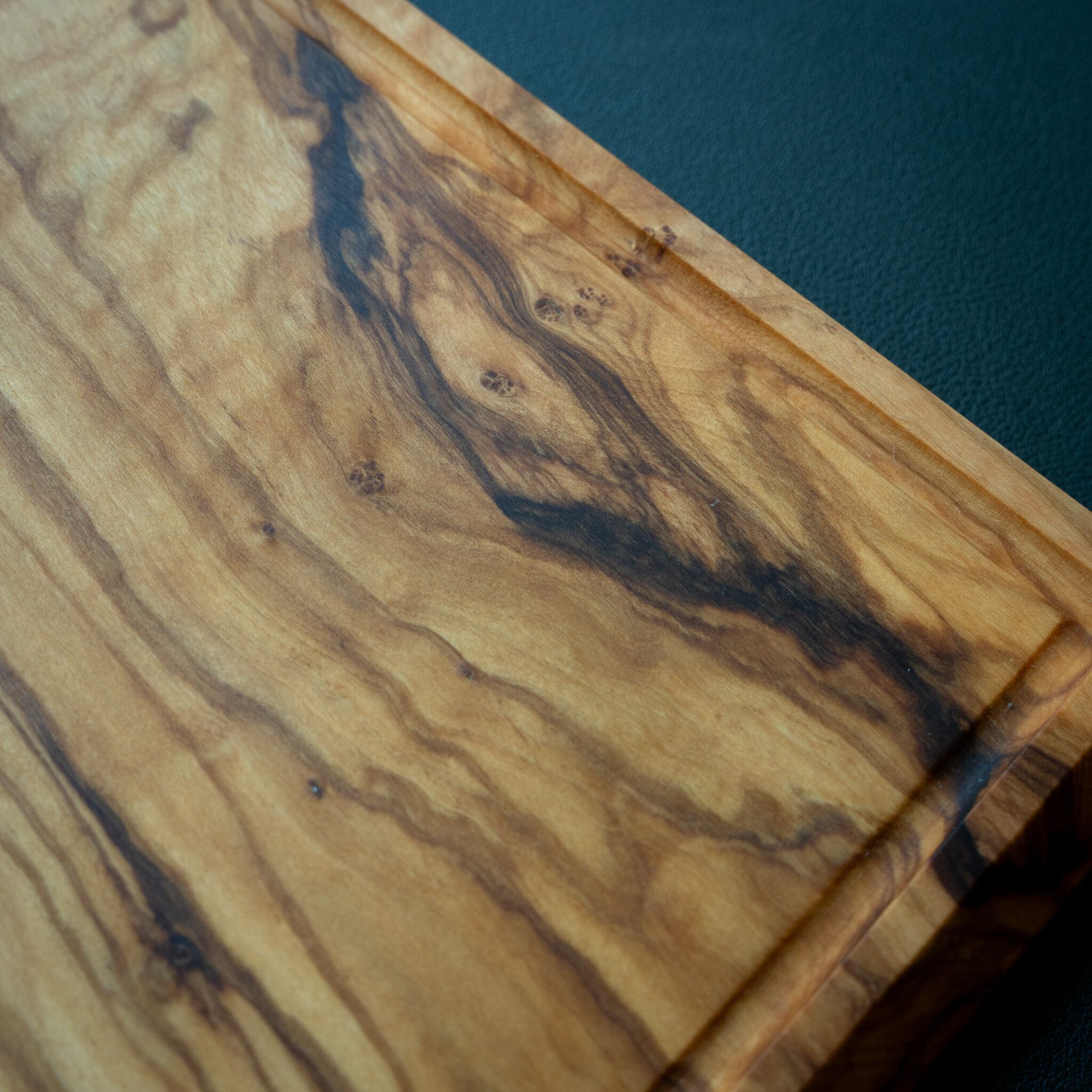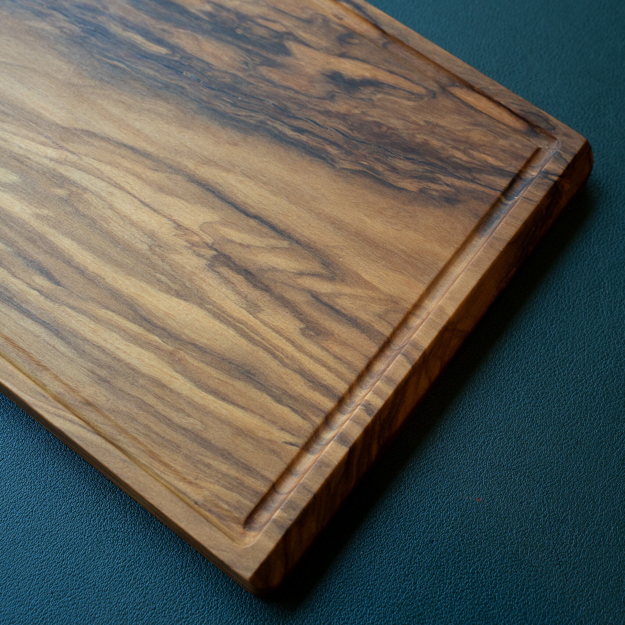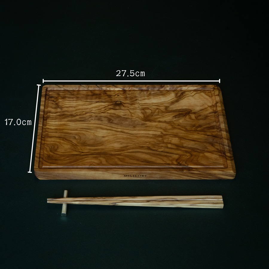 一見して目を奪われるのは、3ヶ所に現れる印象的な節と、それとは別に走る黒く太い虎のような模様。節はオリーブの成長過程で形成された痕跡で、木の生きた証ともいえる存在。その周囲には年輪のように波打つ曲線が広がっており、自然の力強さと静けさを併せ持つ表情を生み出しています。一方で、斜めに走る黒いラインは、木材内部に蓄積された色素が偏って現れたもので、いわば“虎杢”を想起させる大胆なアクセント。これらが同じ面に現れること自体が極めて稀であり、素材の個性が最大限に引き出された一枚です。盤面はナチュラルな色合いで統一されており、力強い個性を持ちながらも全体として美しく調和のとれた仕上がりとなっています。